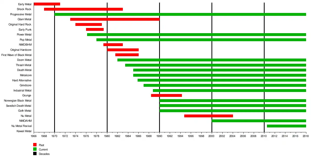 The chart from the film documents Dunn's view on the progression of subgenres of metal that have spawned over time as well as other styles of rock (i.e. hard rock, shock rock, punk rock, and hardcore) that have influence these styles of metal, while also attempting to list the prime examples of bands that fall into each category. Below is a typed version of that chart, which can be found on the second disc of the film's special edition DVD package. A new version was presented in the related TV series Metal Evolution which included a new "Pre-Metal" field that listed non-metal bands that had an influence on heavy metal and also listed additional bands as examples of the various subgenres.