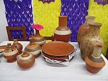 Handcrafts in Mexico vary widely from materials used, techniques and employ and styles preferred.[3] The most prevalent of Mexico's crafts is ceramics/pottery. Ceramics was considered one of the highest art forms during the Aztec Empire, with the knowledge of making pottery said to have come from the god Quetzalcoatl himself. Pre-Hispanic pottery was made by coiling the clay into a circle then up the sides, then scraping and molding the coiled work until the coils could no longer be detected. The Spanish introduced the potters’ wheel and new glazing techniques.[28] Majolica glazed pottery was introduced by the Spanish. Puebla in particular is renowned for its variety of Majolica, which is called Talavera. One distinctive feature of this city is that many kitchens and buildings are decorated with intricately detailed Talavera tiles.[29] Tiles are a subset of ceramic pottery and were used extensively in colonial-era Mexico. These tiles were first fired at a low temperature, then hand-painted with intricate designs, then fired at a high temperature to set the glaze. These are still made, but most decorative tiles used in Mexico are factory-made.[30] Unglazed pottery is still made, but generally it is for decorative purposes only, and copies the designs of pre-Hispanic cultures.[29]