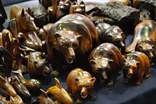 The second group of producers is made up of town and city dwellers from Sonora and Baja California, who began carving after the figures became commercially popular. The latter group produces the figures in grand quantities due to their access to power tools.[2] These families can produce between forty and fifty pieces per day, most of which they sell to wholesalers in Nogales, Sonora. Most of these are then sold in the United States.[3] This has put the Seri at a disadvantage in the market, with their share shrinking. Today there are fewer than fifteen Seri carvers. The carvers total use about 5,000 tons of wood per year for the craft.[2] The development of the carving has been driven by consumer and tourist demand, including the use of asymmetry and abstract forms. Some tourists think a more "primitive" looking carving looks more "authentic" than finer work. Association of the Seri with the craft is still important to its sale and many non Seri falsely put "Handmade by Seri" stickers on their works.[4]