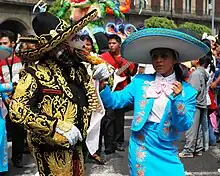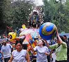 The parade begins at midday on a Saturday late in October, with about 400 uniformed officers needed to clear the parade route and keep order.[7] This route takes the alebrijes through the historic center of Mexico City, from the main square or Zocalo, onto Paseo de la Reforma down to the Angel de la Independencia .[6] Thousands of people, mostly children and their parents, line the 5.5 km parade route to see the creations.[5][8] The alebrijes are accompanied by musical bands such as the Symphonic Band of the Navy, clowns, people on stilts and in costume, cheerleaders, acrobats, lucha libre wrestlers and more to give a Carnival like atmosphere.[5][9][10] In addition to the alebrijes, other figures of cartonería appear such as Catrina figures, 30 cm brightly decorated skulls (related to Day of the Dead) as well as Judas figures (normally made for Holy Saturday) as a tribute to the traditional uses of this craft.[5][11]