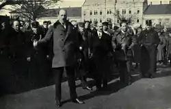 During the First World War, the pro-Entente Károlyi led a small but very active pacifist anti-war maverick faction in the Hungarian parliament.[7] In his parliamentary speeches he opposed the alliance of the Austro-Hungarian Monarchy and the German Empire: instead he advocated friendship between the peoples and argued against war and supported a pro-Entente foreign policy.[8] Károlyi made contact with British and French Entente diplomats behind the scenes in Switzerland during the war.[9] The Károlyi Party was always a weak group with no mass organization and only 20 members in Parliament, most of whom had little commitment to the party. Károlyi argued for peace with the Allies, loosing ties between Austria and Hungary, abolishing the property-based franchise requirements that allowed only 5.8% of the population to vote and run for office before the war, and giving women the right to vote and hold office. In particular, Károlyi demanded in 1915 that veterans should be granted the right to vote, which won so much popular support that it enraged Prime Minister, Count István Tisza. In 1916 Károlyi broke off with his party, which had found his openly pro-Entente attitude to be too radical and dangerous for a war-time pacifist faction in parliament. Therefore, Károlyi formed a new party, called the United Party of Independence of 1848; generally known as the Károlyi Party.