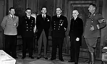 ![]() Teleki (third from L) with Walter Darre (fourth) and Döme Sztójay (fifth) in 1940 | |