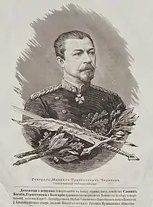 Mikhail Grigoryevich Chernyaev (Russian: Михаил Григорьевич Черняев) (3 November / 22 October 1828, Bender, Bessarabia Governorate – 16 August 1898) was a Russian major general, who, together with Konstantin Kaufman and Mikhail Skobelev, directed the Russian conquest of Central Asia during the reign of Tsar Alexander II.