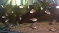 Bolivian rams are biparental, open-spawning cichlids.[8] Limited data are available on reproduction in the wild; in captivity, though, courtship is known to involve various body movements including head shaking, quivering, and preparation of spawning sites, including shallow pits. These behaviours are mainly undertaken by the male and in aquaria are known to last around 48 hours.[3] After courtship, the female deposits some 100–200 ovoid, brownish-coloured eggs on the chosen surface, normally a flattened stone, but occasionally a leaf.[3] The eggs are laid in lines; when the female has laid one line, the male passes over it and fertilises the eggs; the female then continues on to the next line and so on until egg laying is complete. In aquariums at 27 °C (80 °F), eggs take about 60 hours to hatch. During this time, the clutch is primarily cared for by the female, which fans the eggs and often adds sand to the clutch, possibly to camouflage the eggs.[3] Newly hatched fry are transported by the mouths of the parents to the shallow pits dug by the male during courtship and moved regularly between pits. The fry become free-swimming after seven days and are led about in a dense school by the parents for foraging.[3]