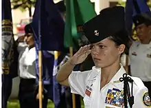 It has been claimed by Samuel Britten on the basis of anecdotal evidence that life on military bases is associated with comparatively greater patriotic sentiments.[20] For example, honoring the American flag is expected. At the end of the business day, on a military installation, the bugle call "To the Color" is played while the flag is lowered.[21] While no longer universal, formerly anybody outside, even if participating in sports or driving a car, was expected to stop their activity and stand at attention.[22] Uniformed personnel salute and non-uniformed people place their hand over their heart.