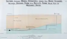 - ↑ The ground at the site selected for the Ontario Farm mine proved very difficult as much of it was sandy clay. At the end of January 1917 the 171st Tunnelling Company began to dig at Boyle's Farm which is just on the southern side of the main road (Mesenstraat/Nieuwkerkestraat) passing by. The shaft went down 30 m (98 ft) and pumps were installed to bring air down and water out of the mine. After tunnelling forward, the miners broke into blue clay, extending the depth to some 40 m (130 ft). After driving the gallery almost 200 m (660 ft) forward, the flooding was so bad that a dam had to be constructed and a new gallery started. Despite these obstacles, the tunnellers arrived under Ontario Farm at the end of May 1917 and installed the 27,000 kg (60,000 lb) ammonal charge with a day to spare.[34]