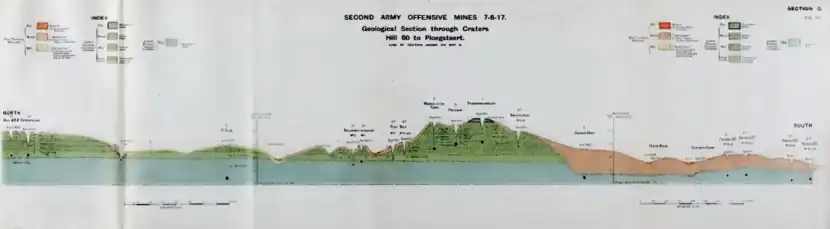 - ↑ The early underground war in the area had involved both the 171st and 172nd Tunnelling Company. After the Battle of Hill 60 in April and May 1915, the Royal Engineers took up mining operations under the hill and the neighbouring ground on a much more ambitious scale. Deep mining under German galleries beneath Hill 60 started in August 1915 with 175th Tunnelling Company, which began a gallery 200 m (220 yd) behind the British front line and passed 27 m (90 ft) beneath the German positions. The British underground works consisted of an access gallery (nicknamed Berlin Tunnel) leading to two mine chambers called Hill 60 A (beneath Hill 60) and Hill 60 B (beneath The Caterpillar). 3rd Canadian Tunnelling Company took over in April 1916 and completed the galleries, Hill 60 A being charged with explosives in July 1916 and the Hill 60 B branch gallery in October. By October 1916, Hill 60 A had been charged with 24,200 kg (53,300 lb) of explosives and Hill 60 B with 32,000 kg (70,000 lb) of high explosive, despite waterlogging and the demolition by a camouflet of 61 m (200 ft) of German gallery above the British diggings, which endangered the British deep mines. 1st Australian Tunnelling Company took over in November 1916 and maintained the completed mines beneath Hill 60 and The Caterpillar over the winter and months of underground fighting until June 1917, when they were fired at the beginning of the Battle of Messines. When the mines were fired, the detonations demolished a large part of Hill 60 and killed c. 10,000 German soldiers between Ypres and Ploegsteert. Fifteen miles away in Lille, German troops ran around "panic-stricken". Odd acoustic effects also increased the shock and Germans on Hill 60 thought that the Kruisstraat and Spanbroekmolen mines were under Messines village, well behind their front line; some British troops thought that they were German counter-mines, going off under British support trenches.[31][32]
