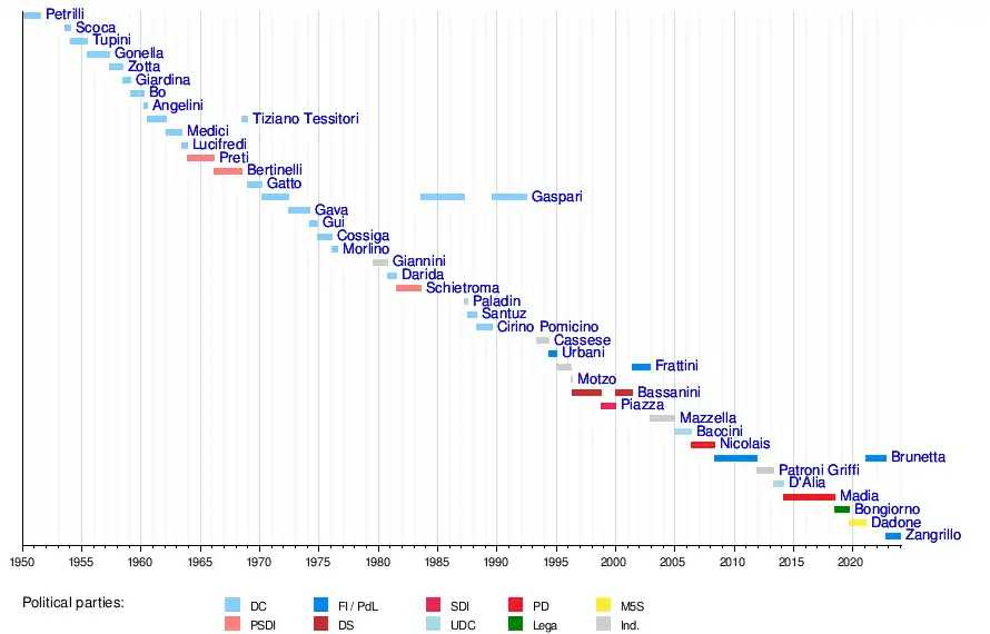27 January 1950 | 26 July 1951 | 1 year, 180 days | Christian Democracy | De Gasperi VI | ||