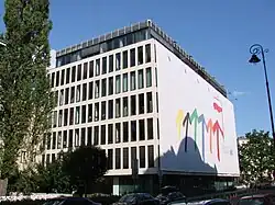 The MSZ's new extension, Articom office building at 21 Szucha Avenue, which in 2011 displayed a large-scale version of Poland's, then-presidency of the Council of the European Union.