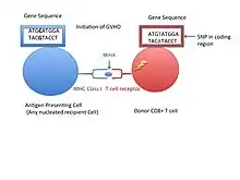The MiHAs bound to a MHC presented on a cell surface may be recognized as a self peptide or not recognized by either CD8+ or CD4+ T cells. The lack of recognition of a T cell to this self antigen is the reason why allogeneic stem cell transplantation for an HLA matched gene or a developing fetus’s MiHAs during pregnancy may not be recognized by T cells and marked as foreign leading to an immune response. Although B cell receptors can also recognize MHCs, immune responses seem to only be elicited by T cells.[6] The consequences of an immune response are seen in allogeneic hematopoietic stem cell transplantation (HCT) when the peptides encoded by polymorphic genes differ between the recipient and the donor T cells. As a result, the donor T cells can target the recipients cells called graft-versus-host disease (GVHD).[5] Although graft or bone marrow rejection can have detrimental effects, there are immunotherapy benefits when cytotoxic T lymphocytes are specific for a self antigen and can target antigens expressed selectively on leukemic cells in order to destroy these tumor cells referred to as graft-versus- leukemia effect (GVL).[3]