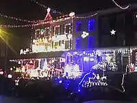 In Baltimore, Maryland, Miracle on 34th Street is a display of holiday lights that takes place annually on the 700 block of 34th Street (between Chestnut Avenue and Keswick Road in Baltimore's Hampden community. The display, which involves the residents of most of the houses on the block (with three-story rowhouses on the north side of the street and two-story ones with second-floor bay windows on the south side), started in 1947 (the same year that its namesake movie debuted), and takes place between late November and late December.[1] The location becomes a major attraction for visitors from all over the area.[2]