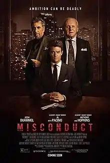 Misconduct is a 2016 American thriller film directed by Shintaro Shimosawa in his directorial debut and written by Simon Boyes and Adam Mason. The film stars Josh Duhamel, Alice Eve, Malin Åkerman, Byung-hun Lee, Julia Stiles, Glen Powell, with Al Pacino and Anthony Hopkins. The film was released in a limited release and through video on demand on February 5, 2016, by Lionsgate Premiere.[3]