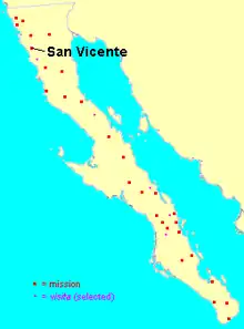 San Vicente was the center of operation on the Dominican missionary frontier and for that reason was protected by 12 to 25 soldiers from the Loreto presidio in what is now Baja California Sur who lived in a walled compound. The military installation was also to protect the territory between the missions of San Fernando de Velicatá and San Diego.