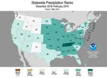 The conterminous United States recorded the wettest meteorological winter (December 2018 - February 2019) during the 1895-2019 period of record, with an average of 9.09 inches (231 mm) of precipitation.[7][8] Tennessee experienced its wettest meteorological winter receiving 25.19 inches (640 mm) of precipitation. Winter precipitation ranked in the top 10 out of 124 years in 15 states within the Mississippi River Basin.[9] Heavy rainfall and subsequent flooding near the end of February 2019 in the Tennessee, Cumberland, Ohio, and Yazoo River basins increased flooding on the Lower Mississippi River.[10][11][12]