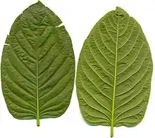 Mitragyna speciosa is an evergreen tree in the genus Mitragyna that can grow to a height of 25 m (82 ft). Its trunk may grow to a 0.9 m (3 ft) diameter.[26] The trunk is generally straight, and the outer bark is smooth and grey.[26] The leaves, ovate-acuminate in shape and opposite in growth pattern, are dark green, glossy on their upper surfaces,[10] and can grow to over 14–20 cm (5.5–7.9 in) long and 7–12 cm (2.8–4.7 in) wide. They have 12 to 17 pairs of veins.[26] The spherical inflorescences, which are deep yellow, grow in clusters of three at the ends of the branches.[27] The calyx-tube is 2 mm (0.08 in) long and has five lobes; the corolla-tube is 2.5–3 millimetres (0.098–0.12 in) long.[26]