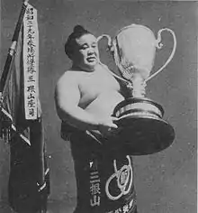 He began his professional career in 1937, joining Takashima stable, reaching the top makuuchi division in 1944. He earned nine kinboshi or gold stars for defeating yokozuna whilst ranked as a maegashira, and seven sanshō or special prizes. In 1953, at the age of 31, he was promoted to the second highest rank of ōzeki, after 16 tournaments in the lower san'yaku ranks, ten at sekiwake and six at komusubi. Three tournaments later he took his only top division yūshō or tournament championship, with a 12–3 record. At 32 years and one month he is the sixth oldest first time yūshō winner since World War II, behind Kyokutenhō, Tamawashi, Tamanoumi, Yoshibayama and Takatōriki. He lost the ōzeki rank in 1955, largely due to injuries. He carried on fighting in the maegashira ranks, last under the shikona Mitsuneyama Hōkoku, until January 1960 when he retired at the age of nearly 38.