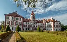 The main landmark of the town is Mnichovo Hradiště Castle. The original Gothic fortress was rebuilt into a Renaissance residence in 1606 by Václav Budovec of Budov. In 1621, it was acquired by Albrecht von Wallenstein. His family, the Waldstein family, owned the castle until 1945. In 1945, it was confiscated by the state. Today the castle is still owned by the state and is open to the public.[6] It is protected as a national cultural monument.[7]