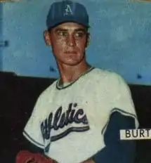 After two victories in seven relief stints in April and early May, Burtschy was optioned to the Portland Beavers of the Pacific Coast League by the relocated Kansas City Athletics in May 1955,[3] and he posted an effective 3.02 earned run average in 29 games to earn another audition with parent Kansas City for 1956. He put up a 3–1 record in 21 games during the season's early weeks, hurling for a second-division team. On May 29, 1956, he pitched two innings of hitless relief against the White Sox, then fell apart in the 12th, yielding three walks and a sacrifice to give Chicago a 7–4 win.[4] His last appearance for the Athletics came on June 9; despite facing the minimum of three batters and holding Baltimore off the scoreboard, he allowed two hits, but each Oriole baserunner was erased caught stealing on throws from Athletics' catcher Joe Ginsberg.[5] Five days later, he was traded with outfielder Bill Renna to the New York Yankees in a four-player deal that brought veteran first baseman Eddie Robinson back to the Athletics. The Yankees sent Burtschy back to Triple-A, where he played for two years before retiring from the game.