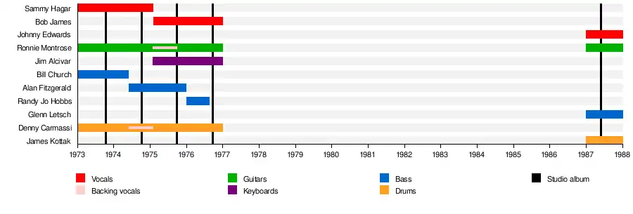 | Past members | Ronnie Montrose – guitar Sammy Hagar – vocals Bill Church – bass Denny Carmassi – drums Alan Fitzgerald – bass Bob James – vocals Jim Alcivar – keyboards Randy Jo Hobbs – bass Glenn Letsch – bass Johnny Edwards – vocals James Kottak – drums |