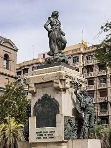 Cast in bronze at Cescati's foundry in Barcelona,[2] the dashing figure of Agustina de Aragón topping off the monument—reportedly inspired in real-life Lucrecia Arana[3] is depicted wearing an artillery open front jacket with an epaulette and a shoulder pad,[4][5] while stepping on a cannon.[6]