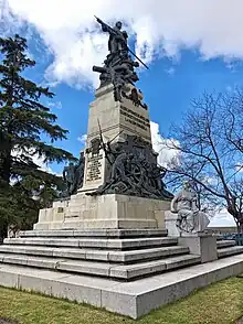 The first body of the pedestal lies in the centre of a wide platform with granite steps.[2] It supports robust mouldings on which the frustum emerges.[2] The sides of the pedestal are ornamented by two large reliefs and by two plaques displaying the coats of arms of Seville (Daoíz's homeland), and Santander (Velarde's homeland) and the respective commemorative inscriptions.[2] An allegory of History lies on the steps of the pedestal;[2] it is sculpted on white marble, contrasting with a bronze relief depicting the last stand at the Monteleón artillery barracks.[2] The other relief shows Daoiz rallying the people of Madrid, engaged in a desperate struggle against the French troops.[2]