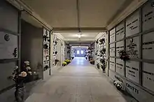 The graves are positioned in order alongside the main path that crosses the entire length of the Cemetery. The more complex and elaborate ones are located underneath the porches by the chapels. The chapels are sections that are primarily dedicated to family graves and are located along the perimeter of the old area. They are divided into left and right porches and are often accompanied by paintings, sculptures, and commemorative texts in memory of the people that have died. The Cemetery also includes two underground areas (long corridors) that contain some of the eldest graves which have text written in Latin, with Roman numbers and that follow the Roman calendar. It also includes a section dedicated to the soldiers that died during World War I, a section dedicated to the people from the city that have been executed, and another area dedicated to missionary nuns.[2]