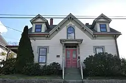The Moore–Hill House is a historic house in Peabody, Massachusetts. It is an excellent example of a Gothic Victorian house, built in 1874 for W. H. Hill. The 1+1⁄2-story wood-frame building has a cross gable roof line, with the main roof line running crosswise. The front cornice, including the central front gable section, is decorated with paired brackets (a typical Italianate decoration), and the front windows have decorative surrounds. The front door is centrally located and sheltered by an ornate entablature, above which is a round-arched window.[2]