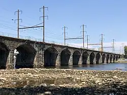 A series of Pennsylvania Railroad (PRR) predecessors operated trains across the nearby Lower Trenton Bridge from 1834 until 1903, when PRR completed a grade separation project through Trenton, including this stone arch bridge on a new alignment.[1]