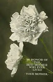 Carnations have come to represent Mother's Day since Anna Jarvis delivered 500 at the first celebration in 1908.[4][17][21] Many religious services held later adopted the custom of giving away carnations.[4] This also started the custom of wearing a carnation on Mother's Day. The founder, Anna Jarvis, chose the carnation because it was her mother's favorite flower.[27] In part due to the shortage of white carnations, and in part due to the efforts to expand the sales of more types of flowers in Mother's Day, florists invented the idea of wearing a pink carnation if your mother was living, or a white one if she was dead; this was tirelessly promoted until it made its way into the popular observations at churches.[28] Other less traditional flower options may include roses, a live blooming plant, flower leis, or a bouquet of a variety of different flowers.