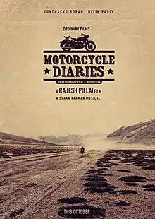 Motorcycle Diaries is an unreleased Indian Malayalam-language film directed by Rajesh Pillai, starring Kunchako Boban and Nivin Pauly in lead roles. The film is based on the mental relationship between one motorcycle and his previous owner. The film was produced by Sugeeth and Satheesh under the banner of Ordinary Films.[1] Bollywood scenarist Suresh Nair, Tamil writer Jeyamohan and Rajesh Pillai co-wrote the screenplay.[2] Santosh Thundiyil and Aneesh Lal crank the camera for the film.[3] Shaan Rahman composes the music and also makes his debut as an actor.[4] The film started shooting in Kolkata in May 2013.[5]