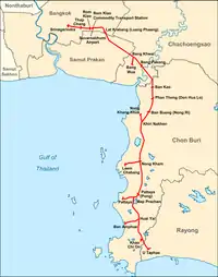 The Bangkok−Ban Chang Motorway (Thai: ทางหลวงพิเศษกรุงเทพมหานคร−บ้านฉาง, RTGS: Thangluang Phiset Krung Thep Maha Nakhon−Ban Chang), designated Motorway Route 7, is a motorway in Thailand, connecting Bangkok to Chonburi, Pattaya, and Map Ta Phut. The country's first intercity motorway, it is part of the Asian Highway Network as AH Route 19 and AH Route 123. The entire length from Bangkok to Pattaya is 125.865 kilometres (78.209 mi) and the posted speed limit is 120 kilometres per hour (75 mph), enforced primarily by speed cameras. An extension between Pong and Map Ta Phut opened in May 2020.[1] It is part of the transport network development project in the eastern seaboard.