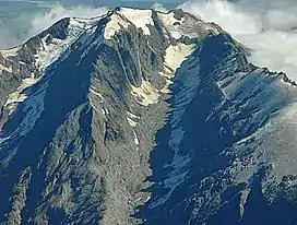 ![]() Mount Adams from the south-east, Escape Glacier at left, Siege Glacier (partially covered in rock debris) at centre. Late summer conditions. | |