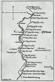 A sketch of Blaxland, Lawson and Wentworth's route across the Blue Mountains in 1813 prepared by F Walker in 1913. The Great Western Road has been inserted to show how closely it has followed the track of the explorers in its general direction.