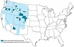 The disease develops from March to September, with the highest infections occurring in June.[9] The disease is found almost exclusively in the western United States and Canada, mostly in high mountain areas such as Colorado and Idaho. The CTFV was first isolated from human blood in 1944.[4]