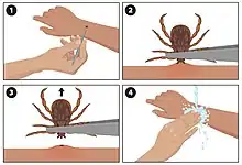 Ticks should be removed promptly and carefully with tweezers and by applying gentle, steady traction. The tick's body should not be crushed when it is removed and the tweezers should be placed as close to the skin as possible to avoid leaving tick mouthparts in the skin. Mouthparts left in the skin can allow secondary infections. Ticks should not be removed with bare hands. Hands should be protected by gloves or tissues and thoroughly washed with soap and water after the removal process.[10]