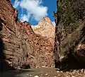 Mountain of Mystery is a 6,565-foot (2,001 m) Navajo Sandstone summit located in Zion National Park, in Washington County of southwest Utah, United States.[4] Mountain of Mystery is situated above The Narrows, towering over 2,100 feet (640 meters) above the floor of Zion Canyon and the North Fork Virgin River which drains precipitation runoff from this mountain. This peak rises above Orderville Canyon on its north side, and Mystery Canyon on the south. Its neighbors include Mount Majestic, Cathedral Mountain, Observation Point, Cable Mountain, Angels Landing, and The Organ. This feature's name was officially adopted in 1934 by the U.S. Board on Geographic Names.[4] The first ascent via the Northeast Buttress was made 15 September 2001, by Brian Cabe and Tom Jones.[5]