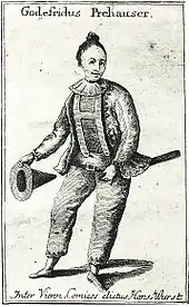 - ↑ Spaethling (2000:87). The original reads "Ich habe dero mir so werthes schreiben richtig erhalten falten, und daraus ersehen drehen, daß der H: vetter retter, die fr: baaß has, und sie wie, recht wohl auf sind hind; wir sind auch gott lob und danck recht gesund hund. ... sie schreiben noch ferners, ja, sie lassen sich heraus, sie geben sich blos, sie lassen sich verlauten, sie machen mir zu wissen, sie erklären sich, sie deüten mir an, sie benachrichtigen mir, sie machen mir kund, sie geben deütlich am tage, sie verlangen, sie begehren, sie wünschen, sie wollen, sie mögen, sie befehlen, daß ich ihnen auch mein Portrait schicken soll schroll. Eh bien, ich werde es ihnen gewis schicken schlicken. Oui, par ma la foi, ich scheiss dir auf d'nasen, so, rinds dir auf d'koi."
