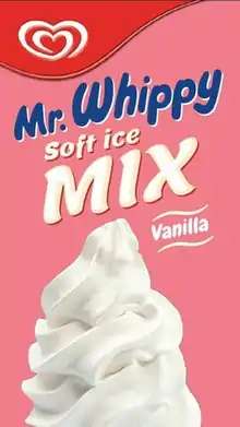 Mr. Whippy (or Mister Whippy) is a brand of soft-mix ice cream produced by Wall's, a subsidiary of Unilever as part of the Heartbrand. Mr. Whippy began as a franchise of ice cream operators, but is now just the name of the soft-mix ice cream, as such, many ice cream vendors selling the soft-mix brand themselves as "Mr. Whippy" and stylise their vehicles and outlets as they wish. Actual franchises of the brand continue separately in Australia and New Zealand.[1]