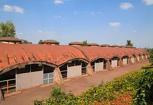 The construction of the station is just as unique as its location, it is located on the portal of the prolonged tunnel that passes under the city center, as a result its rotunda vestibule is located on the upper level (on top of the portal) and passengers have to descend onto the platforms, which are also located on ground level. The station presents a long stretched concrete vault with a row of supports and two side platforms. There is a series of glazed crowns that provide natural lighting at daytime and additional natural lighting comes from the glazed openings at the base of the vault between the supports.