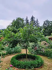The Mulberry garden, originally Morušová zahrada in Czech, is a cottage garden in the Czech Republic, situated in the Czech Central Uplands in the village Režný Újezd, 7 kilometres (4.3 mi) northwest of the town Lovosice. The garden was established in 2014 by local gardeners admiring the English cottage garden style.[1] Apart from different kinds of plants such as perennial plants, English historical roses, Czech roses, annual plants, and bulbs, several uncommon fruit trees are grown, especially various mulberry varieties. Mulberry garden is located along the green tourist track to Boreč hill in the grounds of former Gentlemen's farm, house no. 2.