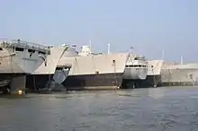 An array of ships part of the National Defense Reserve Fleet are anchored adjacent to Mulberry Island in the middle of the James River. Considered an environmental hazard, the numbers of this reserve fleet are being reduced each year as ships are transported away as scrap. These ships are termed the "Idle Fleet" in local parlance.