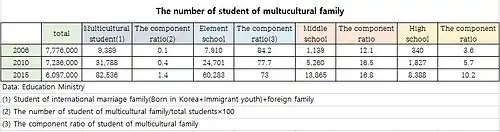 Present situation: In 2015 the number of student of multicultural family in elementary, middle, high schools is 83,000. Students of multicultural family are about 1.4% of the total students. In students of multicultural family, elementary school students are about 73%, middle school students are about 16.8%, high school students are 10.2% of the total in 2015.[9]