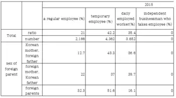 Statistical data about employment status of children of multicultural family shows that regular employee is 21%, temporary employee is 42.2%, day-to-day worker is 35.4%, independent businessman who takes employee is 0%, independent businessman who do not takes employee is 0.8%, unpaid family employee is 0.6% of the total. This shows that children of multicultural family have kind of job like temporary employee and day-to-day worker rather than job like permanent employee, stable job. According to statistical data, about the rate of day-to-day worker, children who both parents are foreigner is 16.1%, children who are grown by Korean mother and foreign father is 36.6%, and children who are grown by foreign mother and Korean father is 39.7%. It means that children who are grown by foreign parents can find more stable job and find job easily than other case.[13]