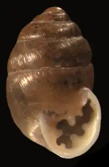 A shell of Multidentula ovularis. Height of the shell is 5.1 mm.