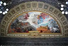 Two rooms that stand out are the decoration of the Reception Hall and the sculptures in the Patio de los Leones.[3] The Reception Hall is on the second floor and designed to imitate the splendor of similar halls in Europe. It is profusely decorated with precious metal and crystal ornaments as well as allegorical murals dedicated to themes such as science, the arts, liberty, history, work and progress. The work devoted to the concept of progress subdivides into four themes of force, justice, wisdom and wealth. This hall became the preferred place for President Porfirio Díaz to perform public declarations and receive dignitaries from abroad.[4] Like the rest of the building the Patio of the Liones synthesizes a number of different architectural styles. The two primary styles seen here are Classic and Gothic with other styles introduced in the forms of sculptures, lighting and sculpted stonework. In the center is a large semicircular staircase to the upper floors.[5]