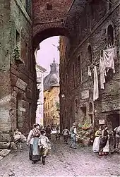 The museum's permanent exhibition focuses on Roman life in the late eighteenth and nineteenth centuries. Major themes are costume, folk dancing, festivals, and crafts.[2] The collection includes paintings, prints, drawings and watercolours, including the series on Roma sparita ("vanished Rome") by Ettore Roesler Franz (1845–1907), and life-size representations of day-to-day life, known as "Roman Scenes". Exhibition of the Franz water colours is rotated in order to conserve them. Other painters represented include Samuel Prout, Bartolomeo Pinelli, Adriano Trojani, Guillaume Frédéric Ronmy, and Arnoldo Corrodi.[1] There is also a gallery of photographs. The “Roman Scenes” show a chemist's, a room where a wine cart is stored, the courtyard of an inn where dancing is taking place, the inside of an inn, a square with a public scribe, and two pipers in front of a votive kiosk.