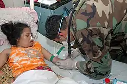 According to the Department of Homeland Security, a total of 6,024 Muslim-American troops served in overseas deployments in the ten years following 9/11, with 14 fatalities reported in Iraq. As of December 2015, there were approximately 5,897 active Muslim members of the US military, accounting for roughly 0.45% of the total. However, practicing Muslim service members are required to shave their beards and other facial hair and often face difficulties obtaining food that meets their dietary requirements, in accordance with military policy.[12] The involvement of Muslim Americans in the military has received increased attention following events such as the September 11 attacks, the 2009 Fort Hood shooting, and Khizr Khan's 2016 Democratic National Convention speech.[13]
