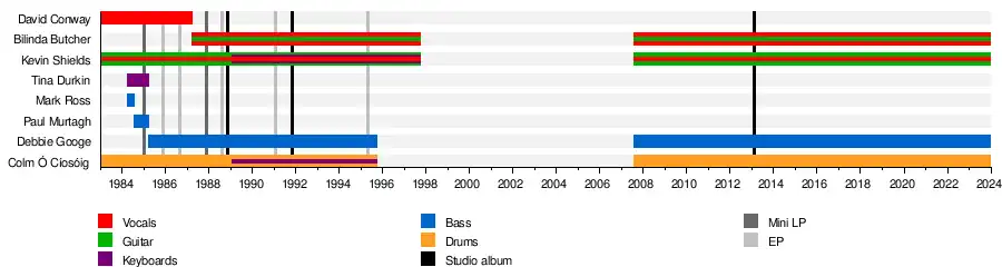 My Bloody Valentine (often stylised in all lowercase or abbreviated as MBV) are an Irish-English alternative rock band formed in Dublin in 1983 and consisting since 1987 of founding members Kevin Shields (vocals, guitar, sampler) and Colm Ó Cíosóig (drums, sampler), with Bilinda Butcher (vocals, guitar) and Debbie Googe (bass). Often cited as a pioneering act in the shoegaze genre, their sound is characterized by dissonant guitar textures, androgynous vocals, and unorthodox production techniques.