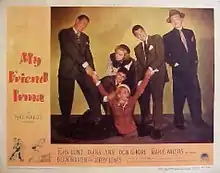 My Friend Irma is a 1949 American comedy film starring John Lund, Diana Lynn, Don DeFore, and Marie Wilson. Directed by George Marshall, it featured the motion picture debut of the Martin and Lewis comedy team of Dean Martin and Jerry Lewis.[3] The film is based upon the CBS radio series My Friend Irma that first aired in 1947. Released by Paramount, it premiered in New York City on September 28,1949.