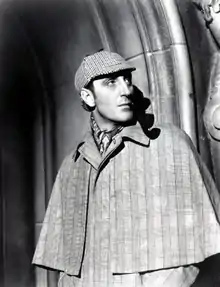 By the 1940s, film detectives came from multiple sources such as radio and comic strips and many others had original scripts.[7] MGM, Warner Brothers, and Paramount had generally halted their production of mystery films by 1942 leaving production to these films being made by RKO, Columbia, Universal and other more minor studios.[6] This led to what author Ron Backer described as 1940s mystery films as being "almost always B-productions" with actors who were "past their prime".[6] These included Chester Morris as Boston Blackie, Warner Baxter as the Crime Doctor, Warren William as the Lone Wolf and Basil Rathbone as Sherlock Holmes.[4] These smaller budget films led to more major productions such as John Huston's The Maltese Falcon (1941) while Murder, My Sweet (1944) introduced the character Philip Marlowe to film. Marlowe would appear again in The Big Sleep (1946) while other films author Martin Rubin deemed as notable detective mysteries included Laura (1944).[8] These detective films drew upon thriller and thriller-related genres with their nocturnal atmosphere and style influenced by expressionism.[8] They often overlapped with film noir, which arose in the mid-1940s and was coined by French critics in 1946.[9] The style was not acknowledge by American filmmakers, critics or audiences while these films were being developed until the 1970s.[10]